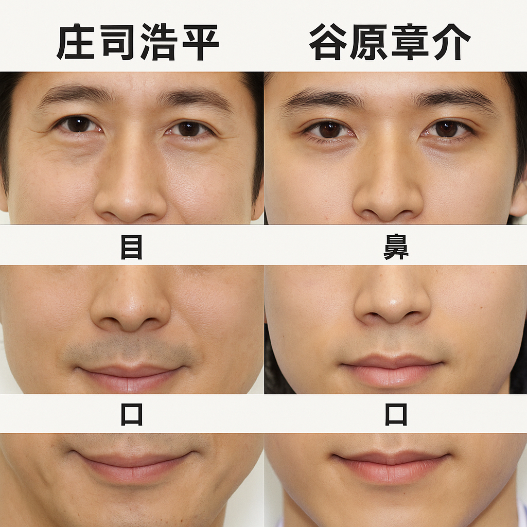 ・違い:庄司さんは鼻先がやや細く、谷原さんは面の整いがより“標準的”。