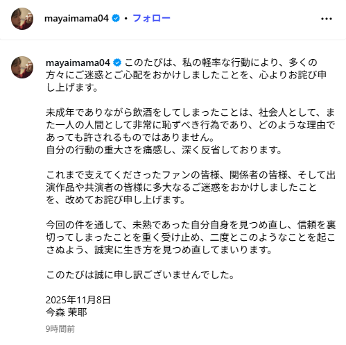 公式が明示した事実は「未成年飲酒により降板」「事務所契約解除」。ここが起点です。