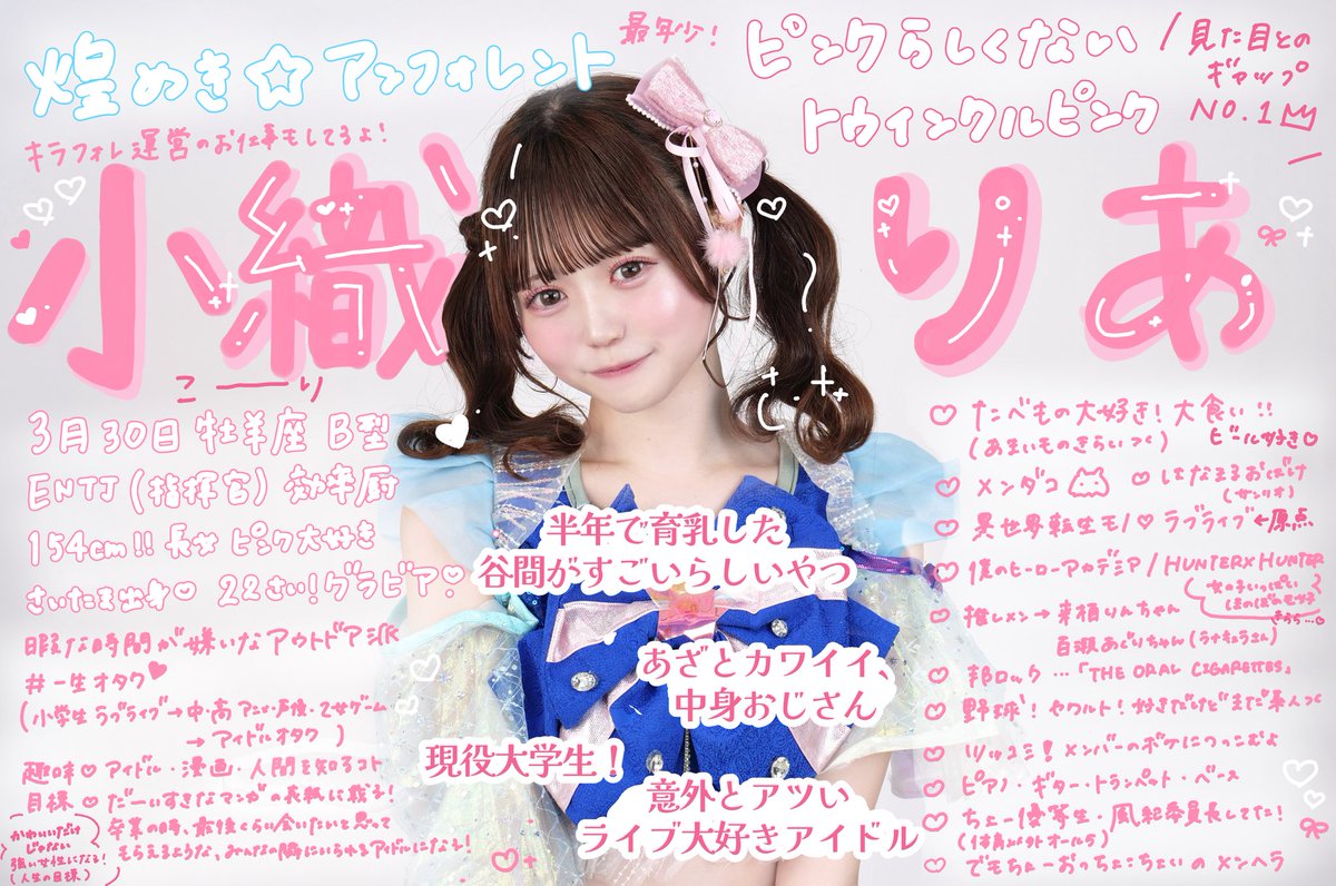 アジア経由宇宙行きアイドルグループ・煌めき☆アンフォレントのトゥインクルピンク担当「小織りあ」さんの、ライブ衣装やオフショット、グラビアまで“きゅるきゅるかわいい”画像を厳選してまとめました。