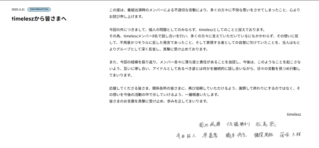 6. timelesz名義の公式謝罪コメント要約