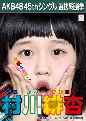 ![]() 村川 緋杏(むらかわ びびあん、1999年〈平成11年〉12月3日 - )は、日本の女性アイドル。女性アイドルグループであるCANDY TUNEのメンバー。HKT48の元メンバーである。 福岡県福岡市出身。アソビシステム所属。 2015年5月10日、『第2回AKB48グループ…
