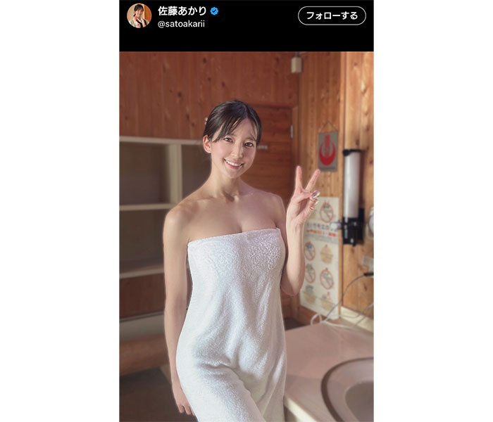 “日本一可愛い剣道女子”、バスタオル一枚で秘湯へ!白い肌と鍛えた身体に「見惚れてしまいました」 “日本一可愛い剣道女子”として人気のタレント・俳優、佐藤あかり(29)が5日、自身のXでテレビ朝日『秘湯ロマン』出演を報告。バスタオル1枚の写真を公開した。 (出典:イーファイト) |