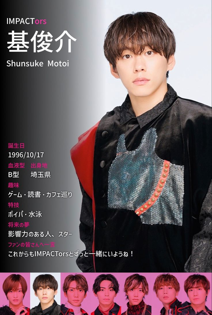 画像提供依頼:顔写真の画像提供をお願いします。(2024年6月) 基 俊介(もとい しゅんすけ、1996年〈平成8年〉10月17日 - )は、日本の歌手、俳優、タレントであり、男性アイドルグループ・IMP.のメンバーである。 埼玉県出身。TOBE所属。 小学5年生の時、母と観劇した『滝沢演舞城』に感…